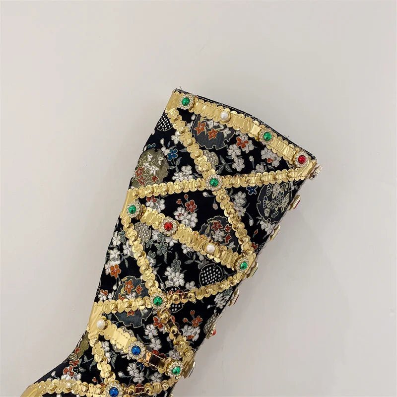 Runway Kniehohe Stiefel Damen, Edelstein Stickerei, Sexy High Heels Gold